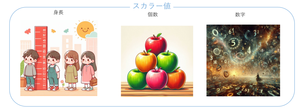 【A】スカラー値は、数値の事です。「-1」、「0.1」、「$\frac{1}{2}$」「100」は全てスカラー値です。身長や、個数も1つの数値で表すことができるのでスカラー値です。ベクトルはx,yの2つの情報を持っており、単純な1つの数値として表すことができないので、スカラー値じゃありません。