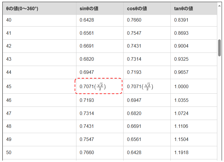 $ \sin45^\circ $だとわかったので、後は三角関数の表を使って、$ \sin45^\circ $の値を求めれば完了です。