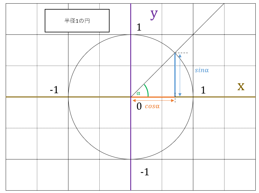 三角関数の表から$ \sin45^\circ $の値は$\dfrac{\sqrt{2}}{2}$です。