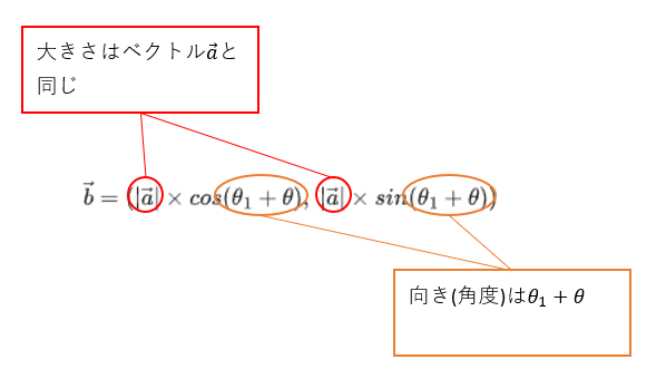 なので、実際に計算して、計算結果である$\boldsymbol{\vec{b}}$が、「$\boldsymbol{ (|\vec{a}|\times \cos(\theta_1 + \theta),\; |\vec{a}|\times \sin(\theta_1 + \theta))}$」となっていれば、$\boldsymbol{\vec{b}}$は、$\boldsymbol{\vec{a}}$をθ回転させたベクトルであると言えます。・・・・(1)