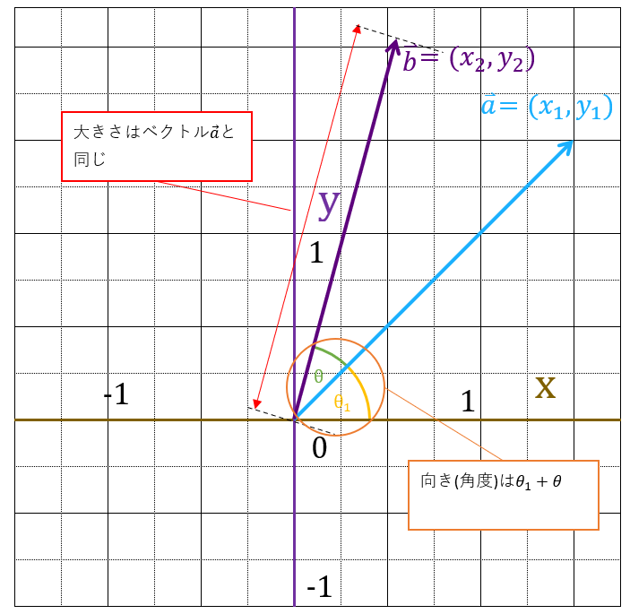 この回転行列の計算によって得られたベクトル$\boldsymbol{\vec{b}=(|\vec{a}|\times cos(\theta_1 + \theta),\; |\vec{a}|\times sin(\theta_1 + \theta))}$は(1)と一致しています。