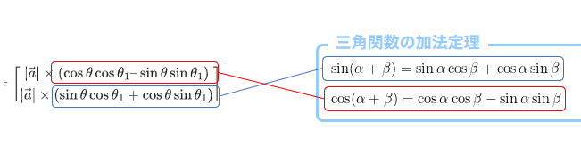 $ \begin{bmatrix} |\vec{a}|\times(\cos\theta\cos\theta_1 – \sin\theta\sin\theta_1) \\ |\vec{a}|\times(\sin\theta\cos\theta_1 + \cos\theta\sin\theta_1) \end{bmatrix} = \begin{bmatrix} |\vec{a}|\times\cos(\theta+\theta_1) \\ |\vec{a}|\times\sin(\theta+\theta_1) \end{bmatrix} $