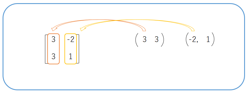$ \begin{bmatrix} \cos30^\circ & -\sin30^\circ \\ \sin30^\circ & \cos30^\circ \end{bmatrix} \times \begin{bmatrix} 3 & -2 \\ 3 & 1 \end{bmatrix} = \begin{bmatrix} 0.8660 & -0.5000 \\ 0.5000 & 0.8660 \end{bmatrix} \times \begin{bmatrix} 3 & -2 \\ 3 & 1 \end{bmatrix} = \begin{bmatrix} 1.0980 & -2.2320 \\ 4.0980 & -0.1340 \end{bmatrix} $最後に、計算結果の行列をベクトルに戻したら完了です。