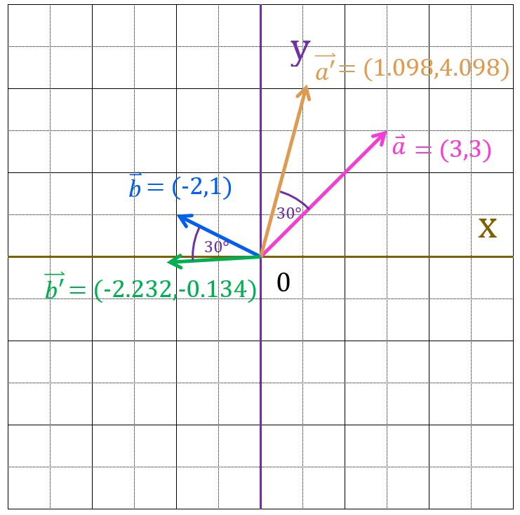 $\vec{b} = (-2,1)$を30度回転回転させると、$\vec{b’} = (-2.2320, -0.1340)$