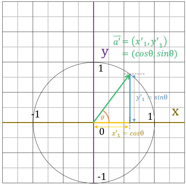 比較すると、$x’_1 = \cos\theta$、$y’_1 = \sin\theta$になっていることがわかります。
