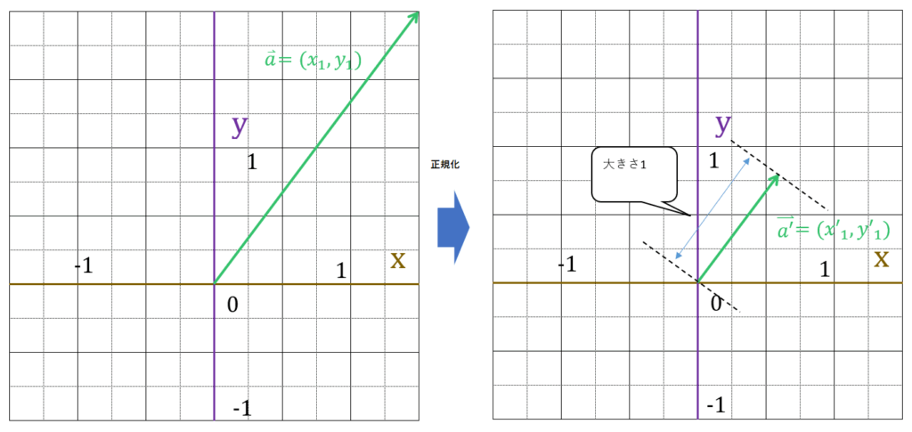 正規化したベクトルを、$\vec{a’}=(x’_1, \; y’_1)$とします。
