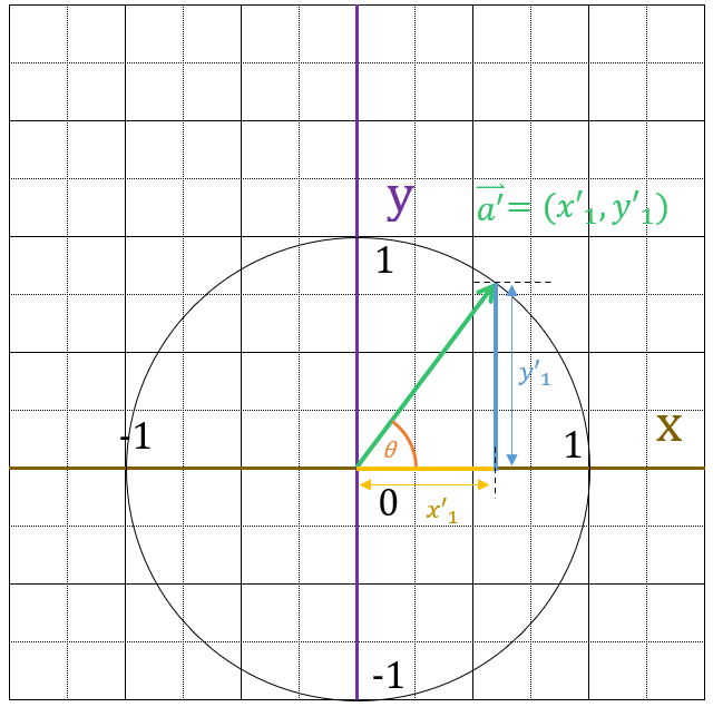 よって、$x$軸とベクトル$\vec{a}$のなす角度を$\theta$とし、ベクトル$\vec{a}$を正規化したベクトルを$\vec{a’} = (x’_1, \;y’_1)$とすると