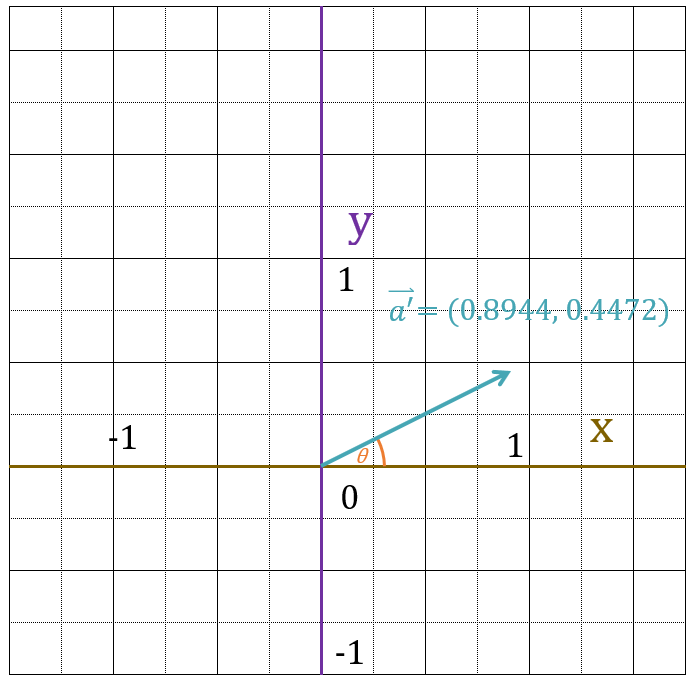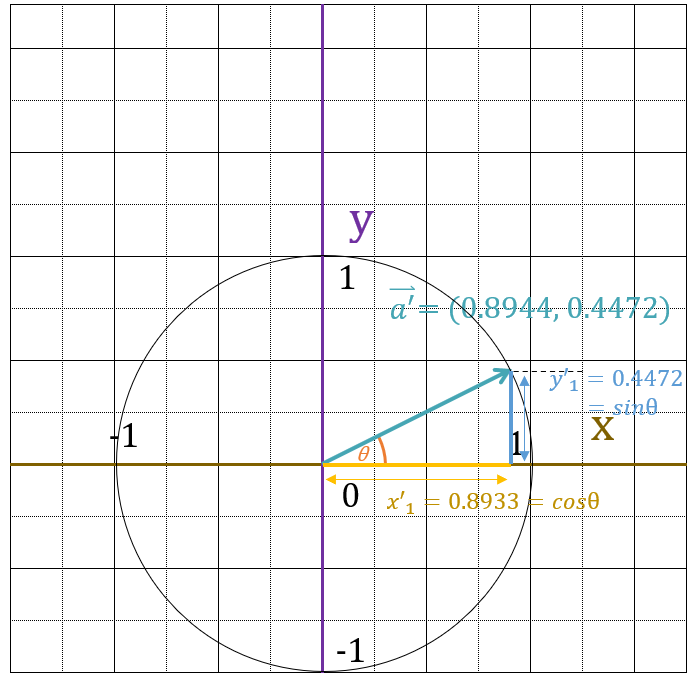 27度です。よって、$\vec{a’} = (0.8944,\;0.4472) = (cos27^\circ,\;sin27^\circ)$が成り立ちます。