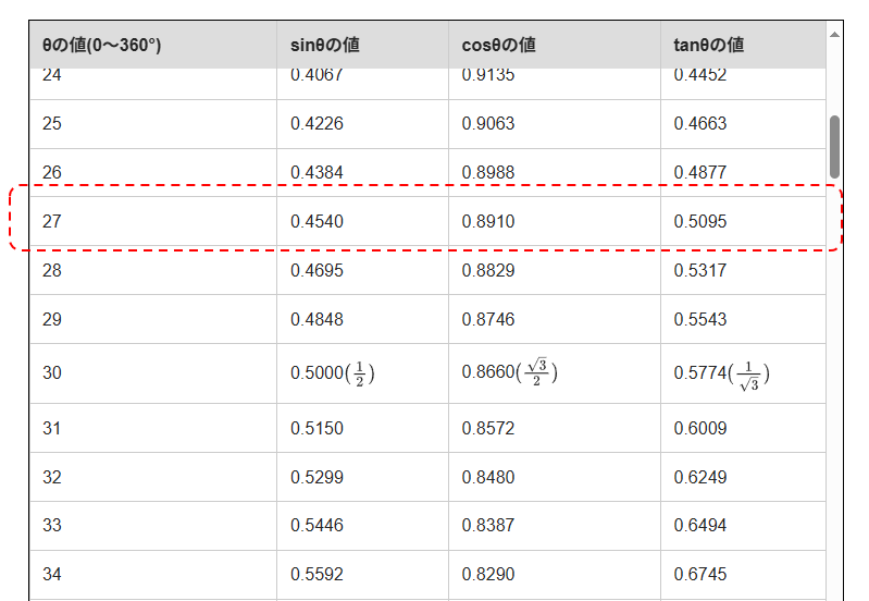 $sin\theta = 0.4472$、$cos\theta = 0.8944$と最も近い行を探すと・・・